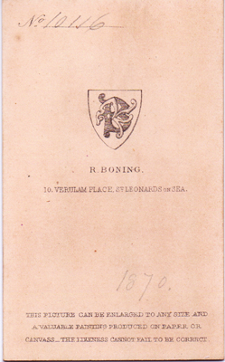 1870 Richard Gravely, photo by R. Boning, 10 Verulam Place, St. Leonards on Sea - photo courtesy of Marion Gower Richard Gravely born c. 1822 Cowfold, Sussex. He is a general practioner. In 1871 the family are in Newick, Sussex. Married twice. His first marriage was to Louisa Wallis, married in 1848 in East Grinstead. She died in 1852