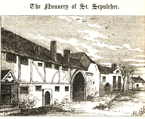 "In the south east part of this city was a Benedictine nunnery, founded, (A.D. 1100.) It was called St. Sepulchre's, and had a Prioress and five or seven nuns, with an income of 38l. 19s. 7d. ob. In the 30th of Henry VIII., the site was exchanged with the Archbishop of Canterbury for other lands, but in 8 years after it was granted to James Hales." UM1751