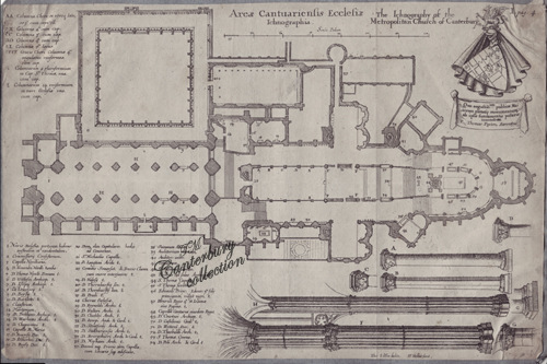 Area Cantuariensis Ecclesia Ichnographia, dedicated to Thomas Peyton, Baronetus with his crest above (I believe this is from Monasticon Anglicanum 1718) *Sir Thomas PEYTON who m. in 1732 Miss SKEVINGTON. June 29th, 1771 when the Baronetcy expired. (A Portrait of Sir Thomas Peyton, Bart., by Mireveldt, 7l, was sold by auction at Canterbury on the 4th inst. 1870)