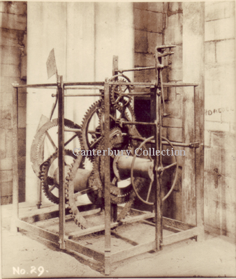 On the card...The clock dates from 1386 and is probably the oldest clock in England. It was in the detached Bell Tower until 1790 when it was removed to the Central Tower of the Cathedral and kept going until 1884 when a new clock was installed. In April 1931 it was placed in the North Transept." a card in my collection.