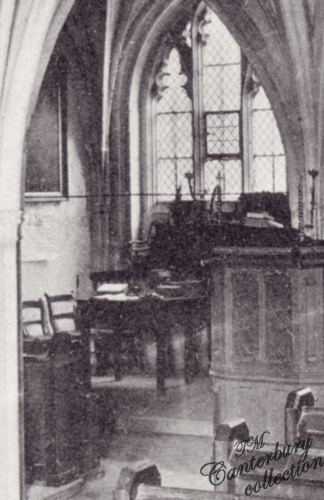 "Founded by Edward the Black Prince in 1363, to commemorate his marriage with Joan the Fair Maid of Kent, in the under-croft of the South Transept. The first congregation of refugee "Strangers" in England was formed in Canterbury in 1547 and owed its existence to the presence of the eminent foreign reformers invited by Archbishop Cranmer. The first use of the crypt for the services of the Walloon and Huguenot Church appears to have been granted by Queen Elizabeth with the consent of the Dean and Chapter in 1575. The area formerly occupied by the congregation extended across the entire width of the Prior Ernulf's crypt from the west wall to the Lady Chapel, the Chapel of St. Gabriel and the Black Prince's Chantry being used as vestries. The tradition that the Strangers carried on their occupation of weaving in the crypt has no foundation in fact and seems to be simply a mistaken induction from the circumstances that the alien immigrants who worshipped in the crypt were also weavers in the city." Canterbury Views c. 1903